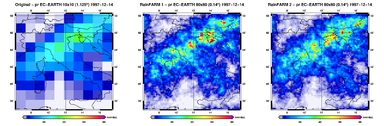 Fig. 413 Example of daily cumulated precipitation from the CMIP5 EC-EARTH model on a specific day, downscaled using RainFARM from its original resolution (1.125°) (left panel), increasing spatial resolution by a factor of 8 to 0.14°; Two stochastic realizations are shown (central and right panel). A fixed spectral slope of s=1.7 was used. Notice how the downscaled fields introduce fine scale precipitation structures, while still maintaining on average the original coarse-resolution precipitation. Different stochastic realizations are shown to demonstrate how an ensemble of realizations can be used to reproduce unresolved subgrid variability. (N.B.: this plot was not produced by ESMValTool - the recipe output is netcdf only).#