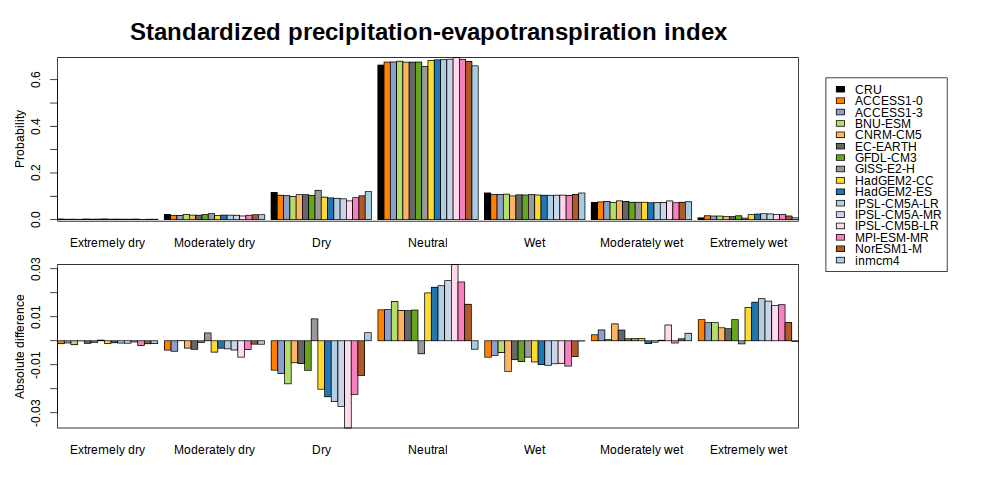 Fig. 422 (top) Probability distribution of the standardized precipitation-evapotranspiration index of a sub-set of the CMIP5 models, and (bottom) bias relative to the CRU reference data set.#