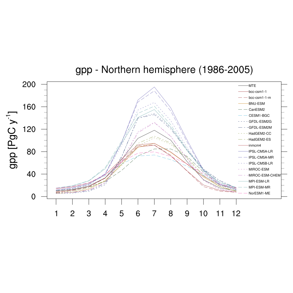 Fig. 341 Seasonal cycle plot for nothern hemisphere gross primary production (GPP) over the period 1986-2005. Similar to Anav et al. (2013), Figure 9.#