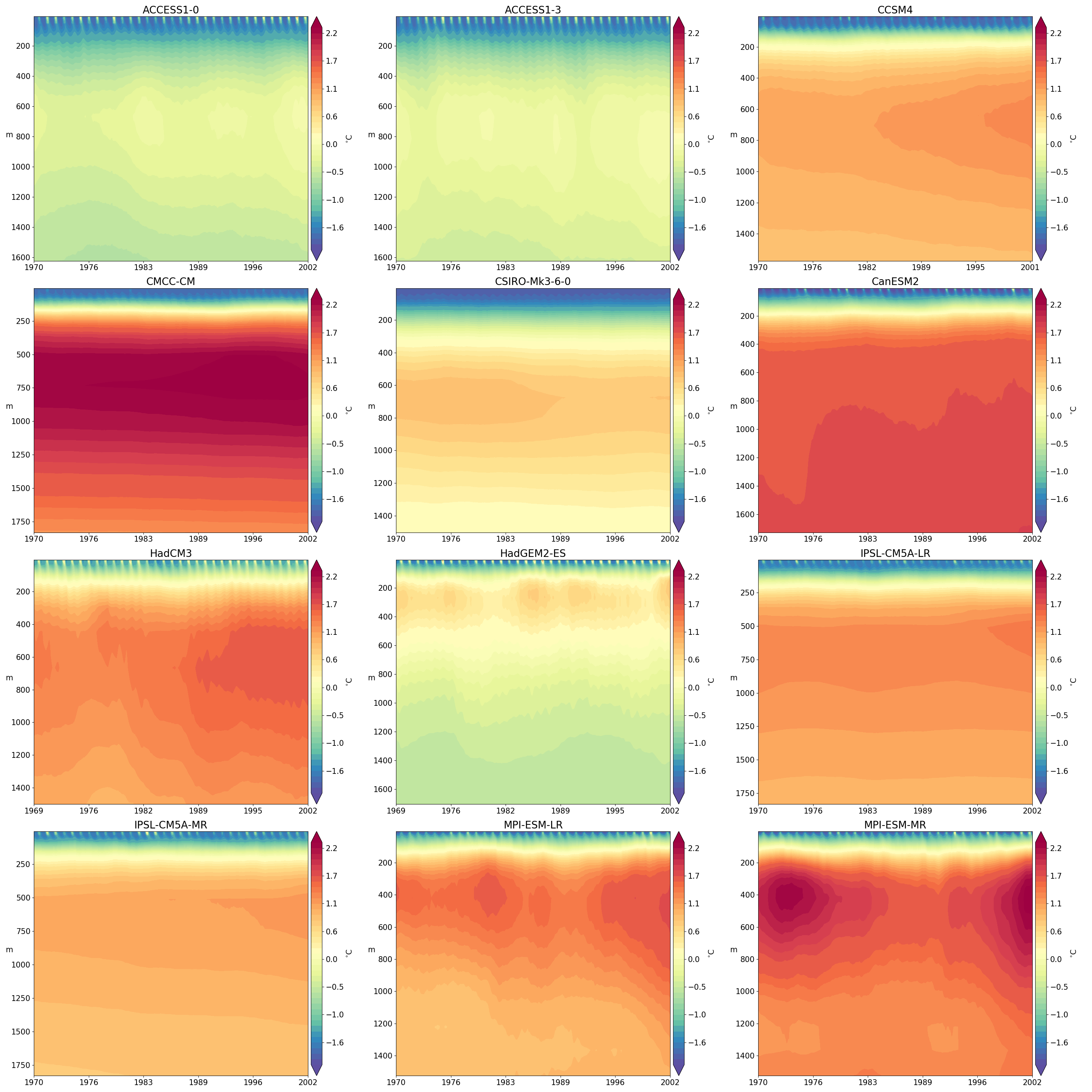 Fig. 353 Hovmoller diagram of monthly spatially averaged potential temperature in the Eurasian Basin of the Arctic Ocean for selected CMIP5 climate models (1970-2005).#