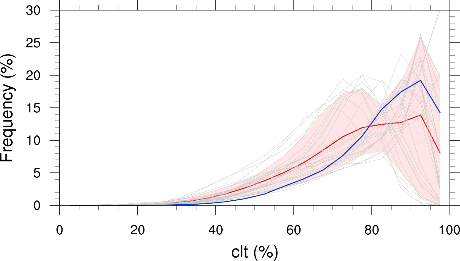 Fig. 147 Frequency distribution of monthly mean total cloud cover from CMIP6 models in comparison to ESACCI-CLOUD data. The red curve shows the multi-model average, the blue curve the ESACCI-CLOUD data and the thin gray lines the individual models. The red shading shows ±1 standard deviation of the inter-model spread. Produced with recipe_lauer22jclim_fig9-11c_pdf.yml (diagnostic script clouds_pdf.ncl).#