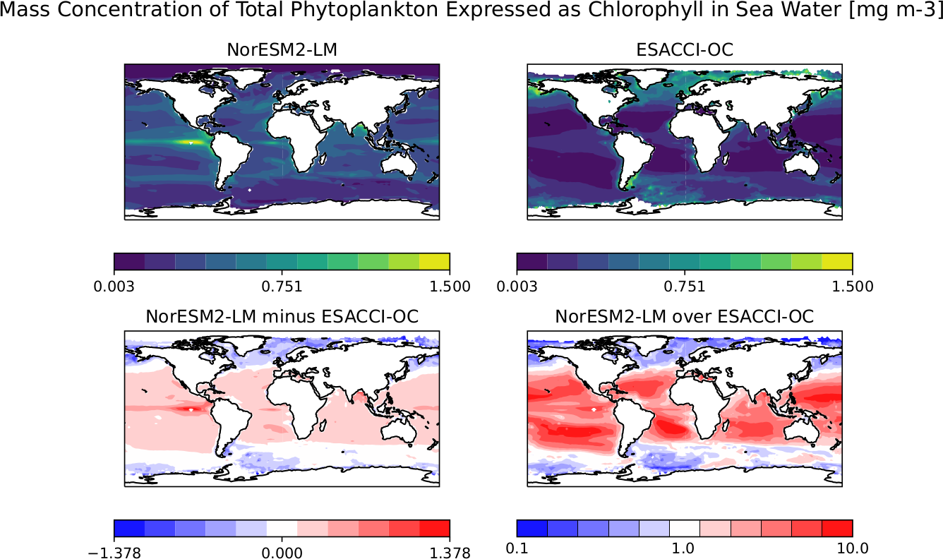 Fig. 362 Surface chlorophyll from ESACCI-OC ocean colour data version 5.0 and the CMIP6 model NorESM2-LM. This model overestimates chlorophyll compared to the observations.#