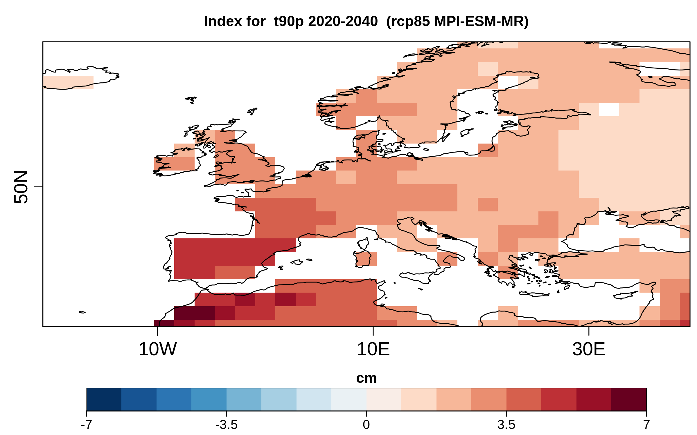 Fig. 167 Average change in the heat component (t90p metric) of the Combined Climate Extreme Index for the 2020-2040 compared to the 1971-2000 reference period for the RCP 8.5 scenario simulated by MPI-ESM-MR.#