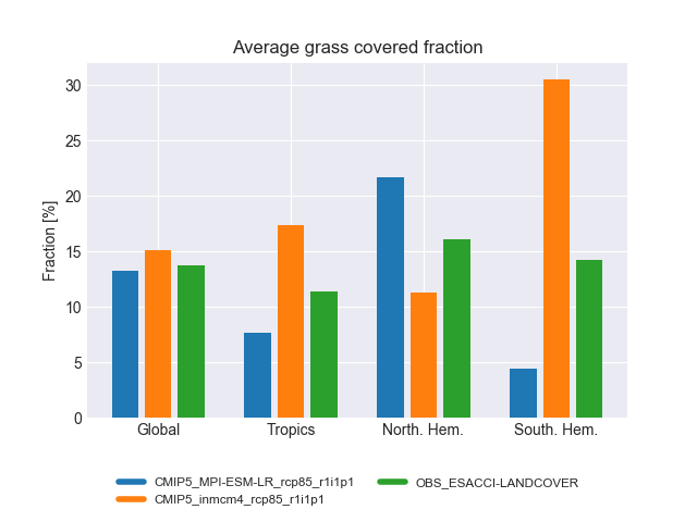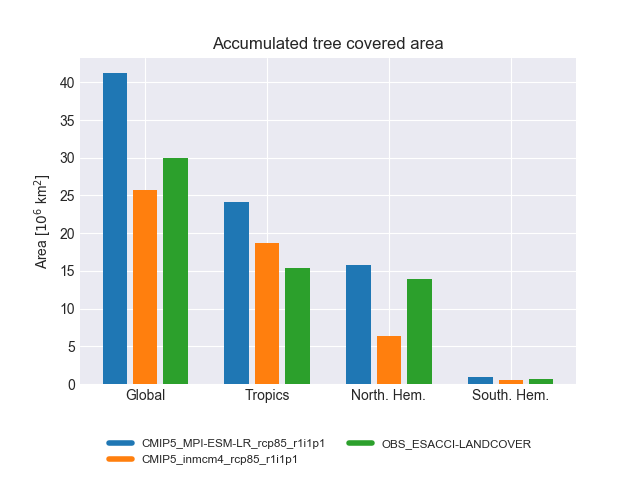 The diagnostic computes the accumulated and fractional extent of major land cover classes, namely bare soil, crops, grasses, shrubs and trees. The numbers are compiled for the whole land surface as well as separated into Tropics, northern Extratropics and southern Extratropics. The cover fractions are compared to ESA-CCI land cover data.