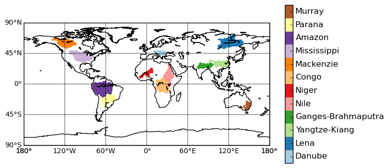 The catchments are Amazon, Congo, Danube, Ganges-Brahmaputra, Lena, Mackenzie, Mississippi, Murray, Niger, Nile, Parana and Yangtze-Kiang. Variable names are expected to follow CMOR standard, e.g. precipitation as pr, total runoff as mrro and evapotranspiration as evspsbl with all fluxes given in kg m-2 s-1 . Evapotranspiration furthermore has to be defined positive upwards.