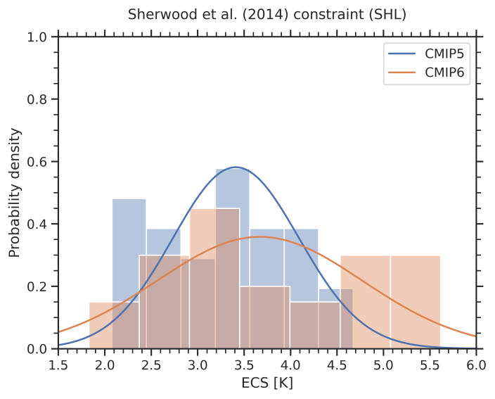 Fig. 255 Probability densities for the constrained ECS (solid lines) and the unconstrained model ensembles (histograms) of the emergent relationship shown in the figure above.#