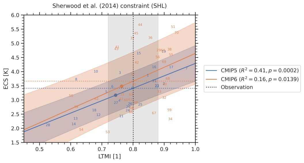 Fig. 254 Emergent relationship (solid blue and orange lines) of the Sherwood et al. (2014) emergent constraint, which is based on the lower tropospheric mixing index (LTMI). The numbers correspond to individual CMIP models. The shaded area around the regression line corresponds to the standard prediction error, which defines the error in the regression model itself. The vertical dashed black line corresponds to the observational reference with its uncertainty range given as standard error (gray shaded area). The horizontal dashed lines show the best estimates of the constrained ECS for CMIP5 (blue) and CMIP6 (orange). The colored dots mark the CMIP5 (blue) and CMIP6 (orange) multi-model means.#