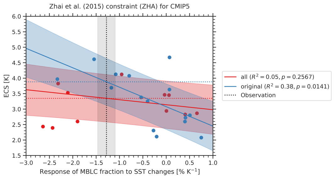 Fig. 256 Emergent relationship of the Zhai et al. (2015) emergent constraint for different subsets of CMIP5 models. Blue circles show the 15 CMIP5 models used in the original publication (except for CESM1-CAM5); the solid blue line and blue shaded area show the emergent relationships evaluated on these models including the uncertainty range. In this study, 11 more CMIP5 models have been added (red circles). The corresponding emergent relationship that considers all available CMIP5 models is shown in red colors. This relationship shows a considerably lower coefficient of determination (\(R^2\)) and higher p-value than the relationship using the original subset of CMIP5 models. The vertical dashed line and shaded area correspond to the observational reference, and the horizontal dashed lines show the corresponding ECS constraints using this observation.#
