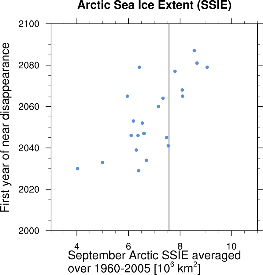 Fig. 404 Scatter plot of mean historical September Arctic sea ice extent vs 1st year of disappearance (RCP8.5) (similar to IPCC AR5 Chapter 12, Fig. 12.31a). [seaice_ecs.ncl]#