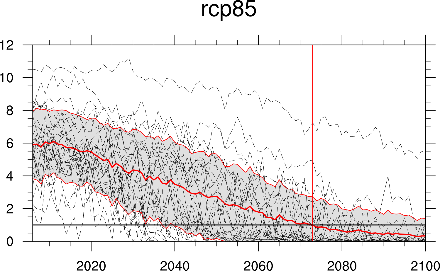 Fig. 403 Time series of September Arctic sea ice extent for individual CMIP5 models, multi-model mean and multi-model standard deviation, year of disappearance (similar to IPCC AR5 Chapter 12, Fig. 12.31e). [seaice_yod.ncl]#