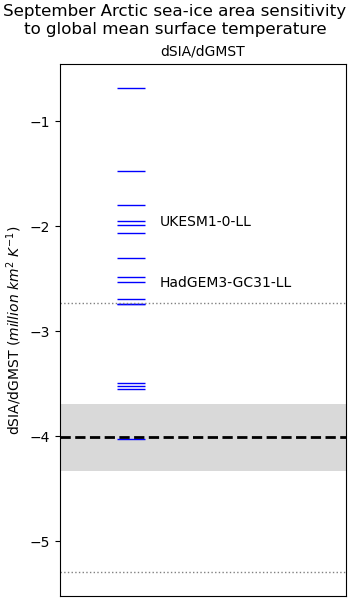 Fig. 407 Plot of sensitivity of northern hemisphere sea ice area loss (millions of square kilometres) in the month of September to the annual mean global temperature change (K).#