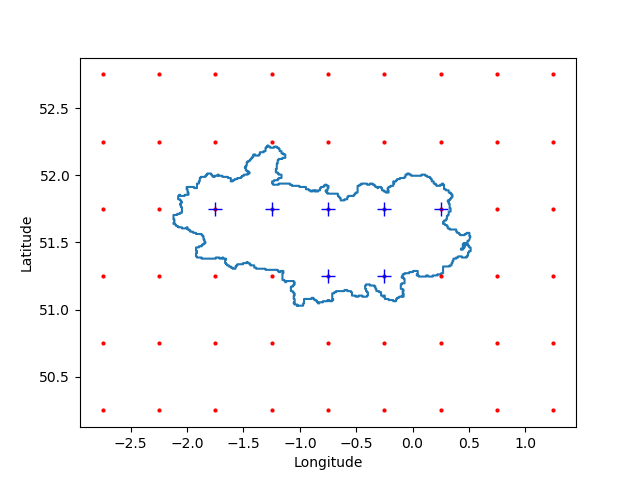 Fig. 409 Example of the selection of model grid points falling within (blue pluses) and without (red dots) a provided shapefile (blue contour).#