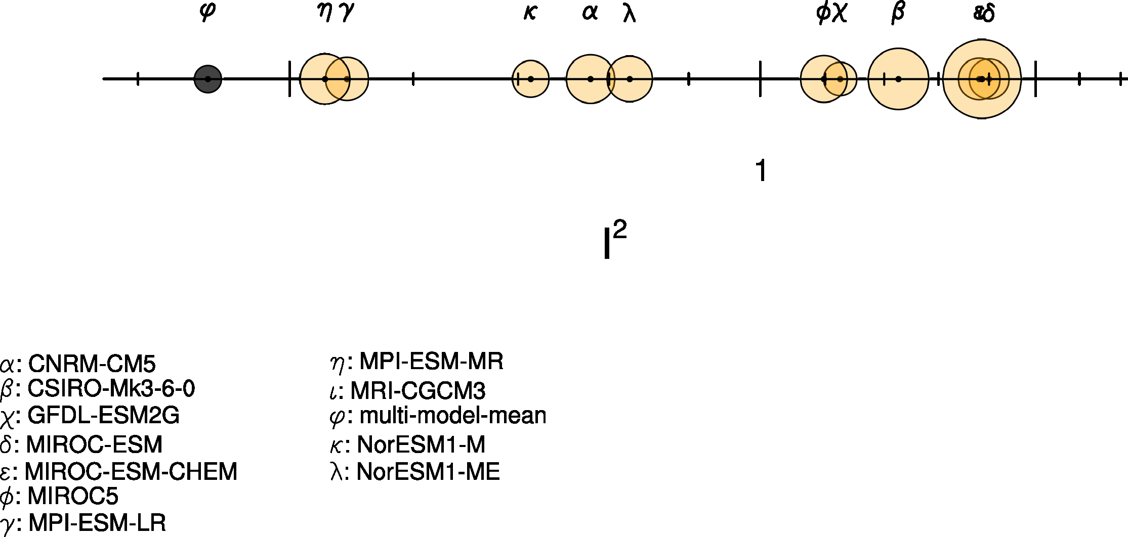 Fig. 231 Performance index I2 for individual models (circles). Circle sizes indicate the length of the 95% confidence intervals. The black circle indicates the I2 of the multi-model mean (similar to Reichler and Kim (2008), Figure 1).#