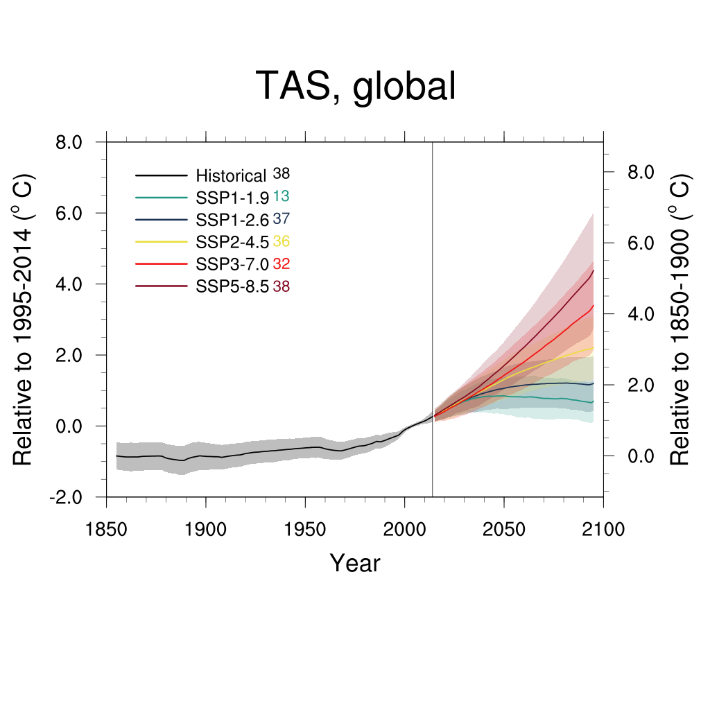 Fig. 274 Global average temperature time series (11-year running averages) of changes from current baseline (1995–2014, left axis) and pre-industrial baseline (1850–1900, right axis, obtained by adding a 0.84 ◦C offset) for SSP1-1.9, SSP1-2.6, SSP2-4.5, SSP3-7.0 and SSP5-8.5.#