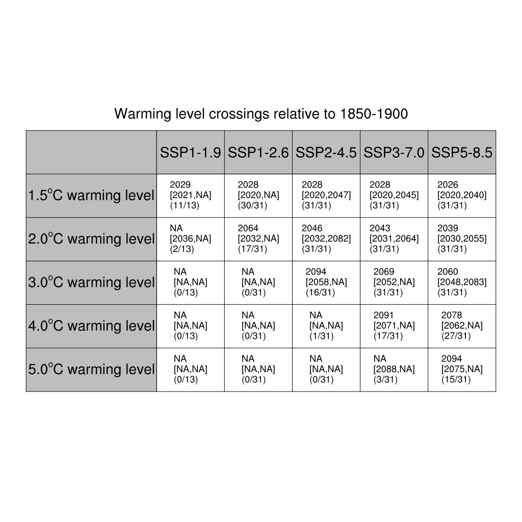 Fig. 276 Times (best estimate and range – in square brackets – based on the 5 %–95 % range of the ensemble after smoothing the trajectories by 11-year running means) at which various warming levels (defined as relative to 1850–1900) are reached according to simulations following, from left to right, SSP1-1.9, SSP1-2.6, SSP2-4.5, SSP3-7.0 and SSP5-8.5. Crossing of these levels is defined by using anomalies with respect to 1995–2014 for the model ensembles and adding the offset of 0.84 to derive warming from pre-industrial values. We use a common subset of 31 models for the Tier 1 scenarios and all available models (13) for SSP1-1.9, while Table A7 shows the result of using all available models under each scenario. The number of models available under each scenario and the number of models reaching a given warming level are shown in parentheses. However, the estimates are based on the ensemble means and ranges computed from all the models considered (13 or 31 in this case), not just from the models that reach a given level. An estimate marked as “NA” is to be interpreted as “not reaching that warming level by 2100”. In cases where the ensemble average remains below the warming level for the whole century, it is possible for the central estimate to be NA, while the earlier time of the confidence interval is not, since it is determined by the warmer end of the ensemble range.#