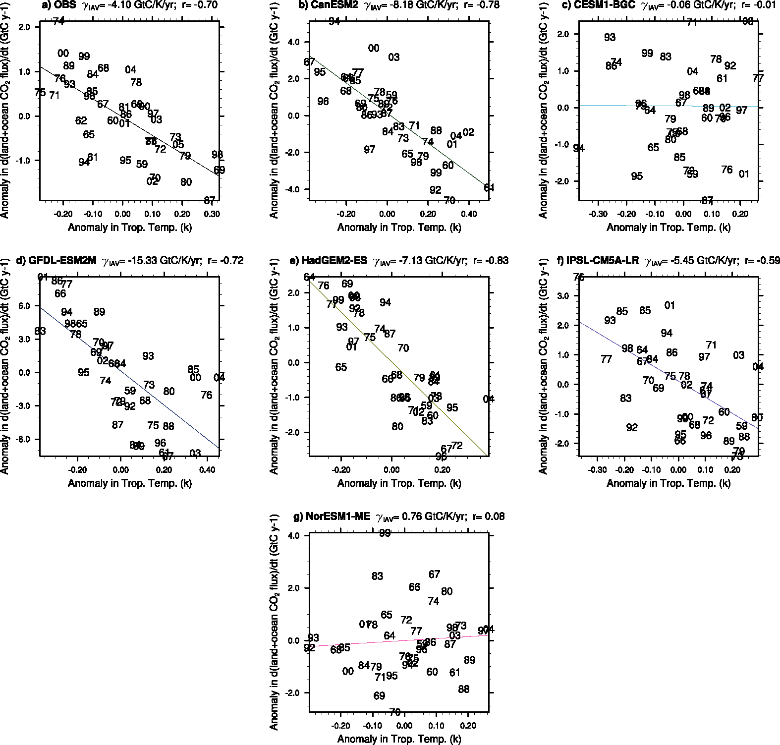 Fig. 251 Correlations between the interannual variability of global co2flux (nbp+fgco2) and tropical temperature for the individual CMIP5 models using esmHistorical simulations, and for observations.#
