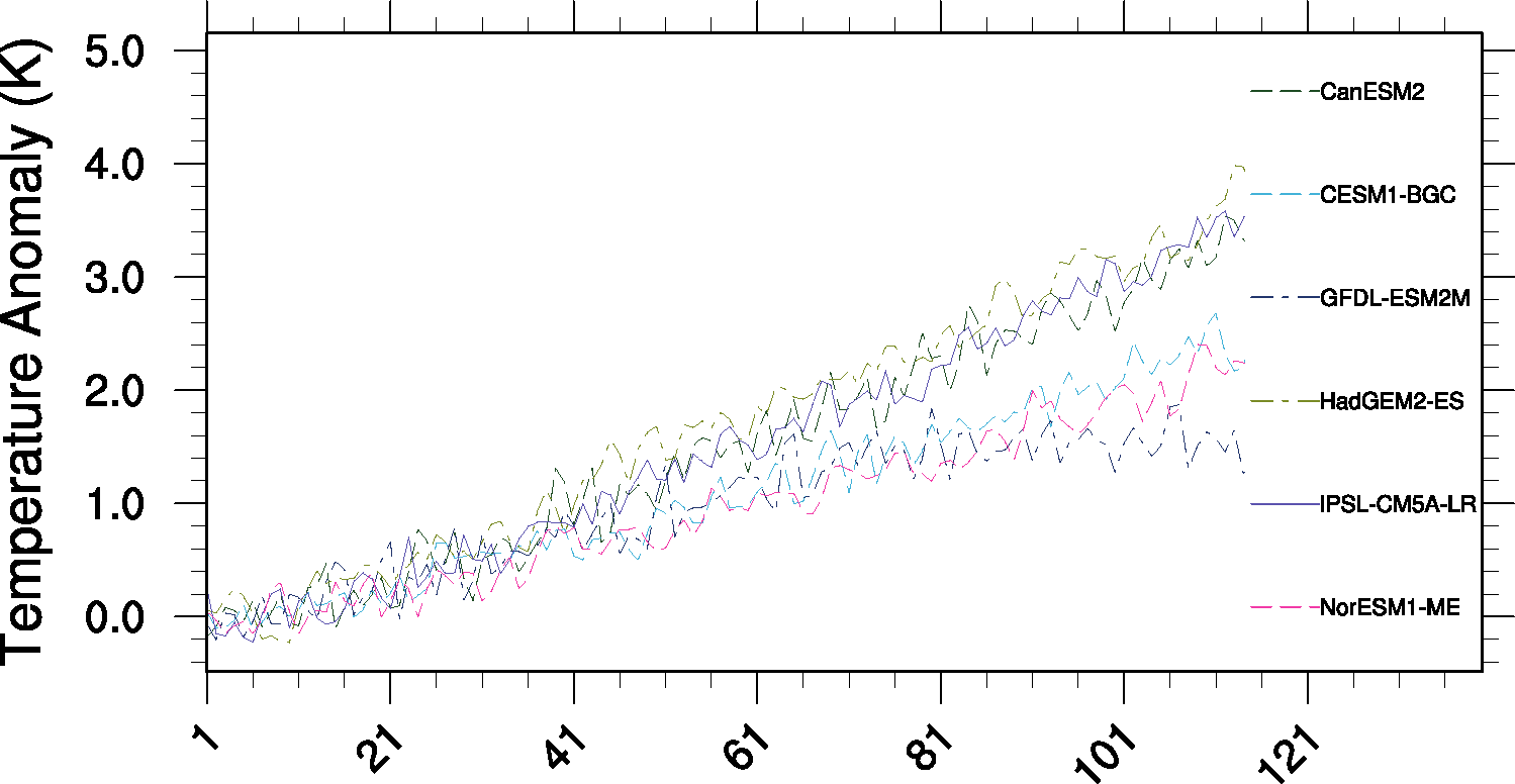 Fig. 250 Time series of tropical (30S to 30N) mean near surface temperature (tas) change between year 30 and year 110 for the CMIP5 models simulated with prescribed CO2 (1%/yr CO2 increase) coupled simulation (1pctCO2).#